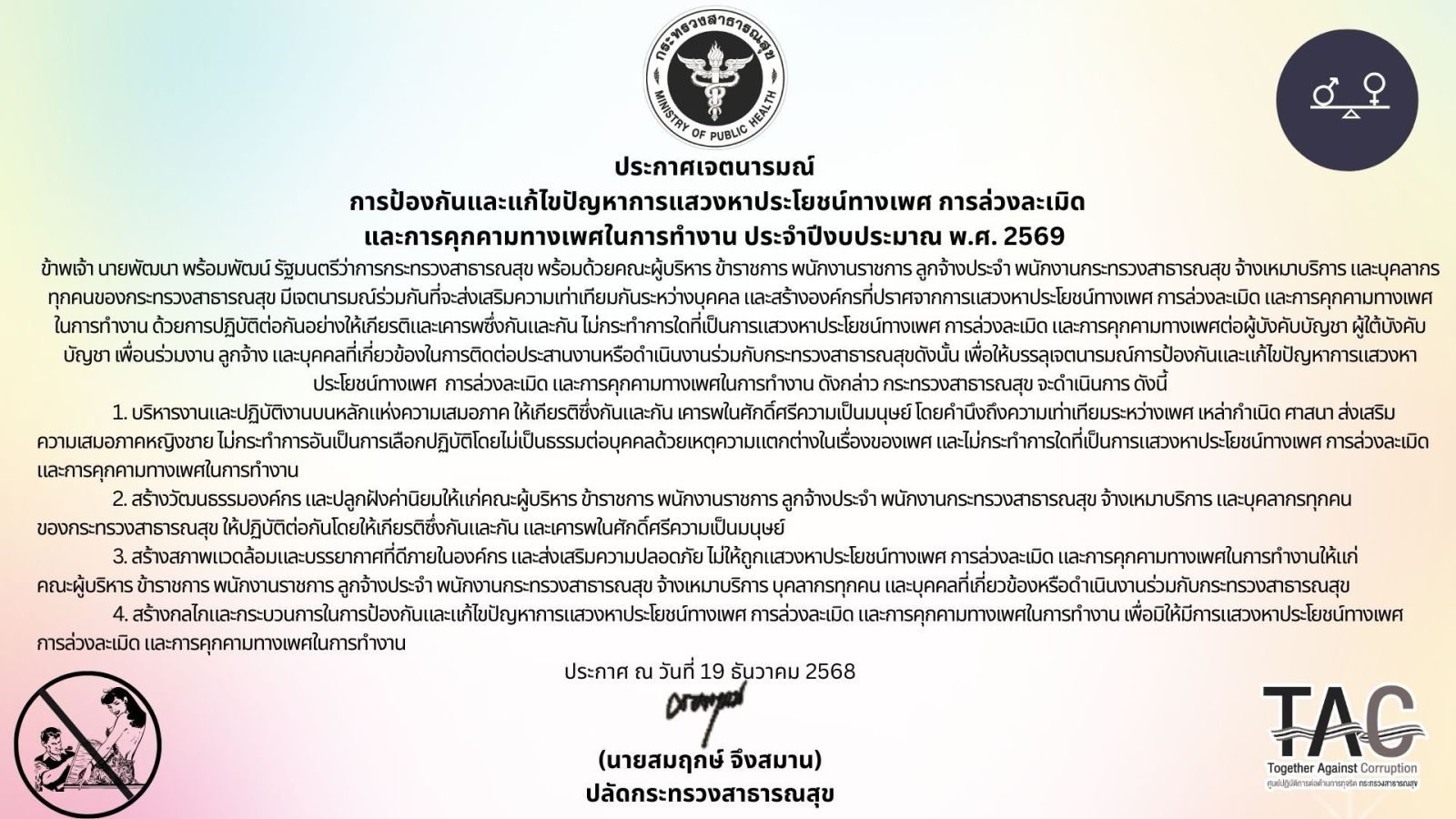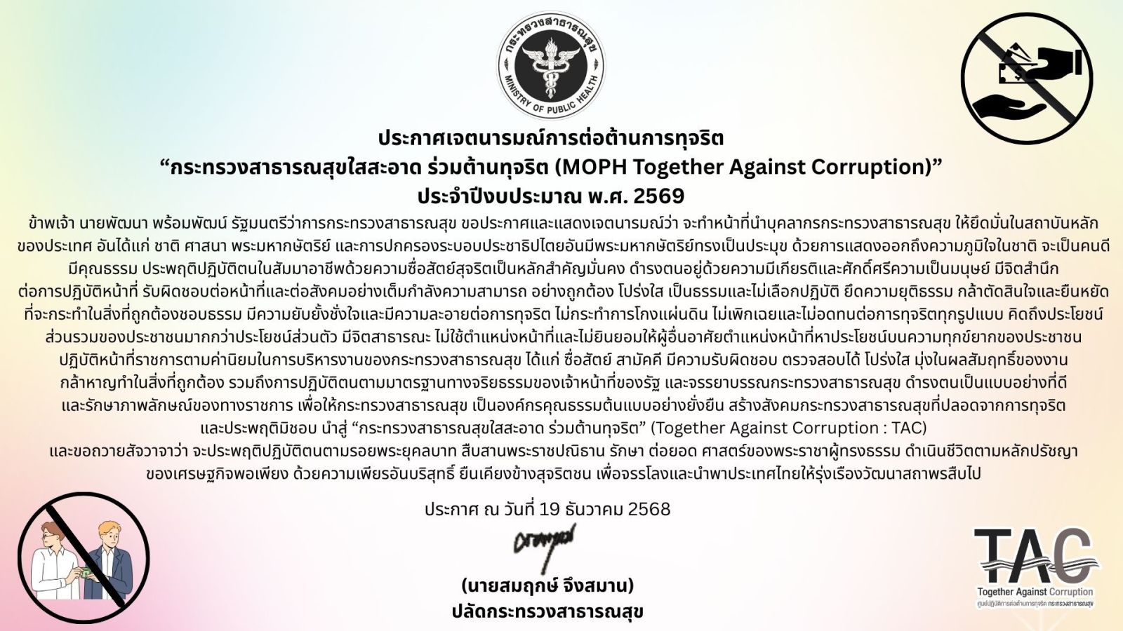 โรงพยาบาลบัวลายขอประกาศเจตนารมณ์การต่อต้านการทุจริต "กระทรวงสาธารณสุขใสสะอาด ร่วมต้านทุจริต (MOPH Together Against Corruption) ประจำปีงบประมาณ พ.ศ.2569"