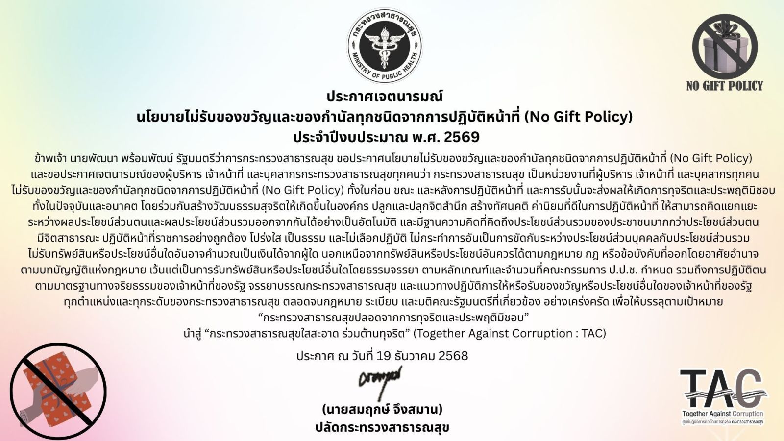 โรงพยาบาลบัวลายขอประกาศเจตนารมณ์นโยบายไม่รับของขวัญและของกำนัลทุกชนิดจากการปฏิบัติหน้าที่(No Gift Policy) ประจำปีงบประมาณ พ.ศ. 2569